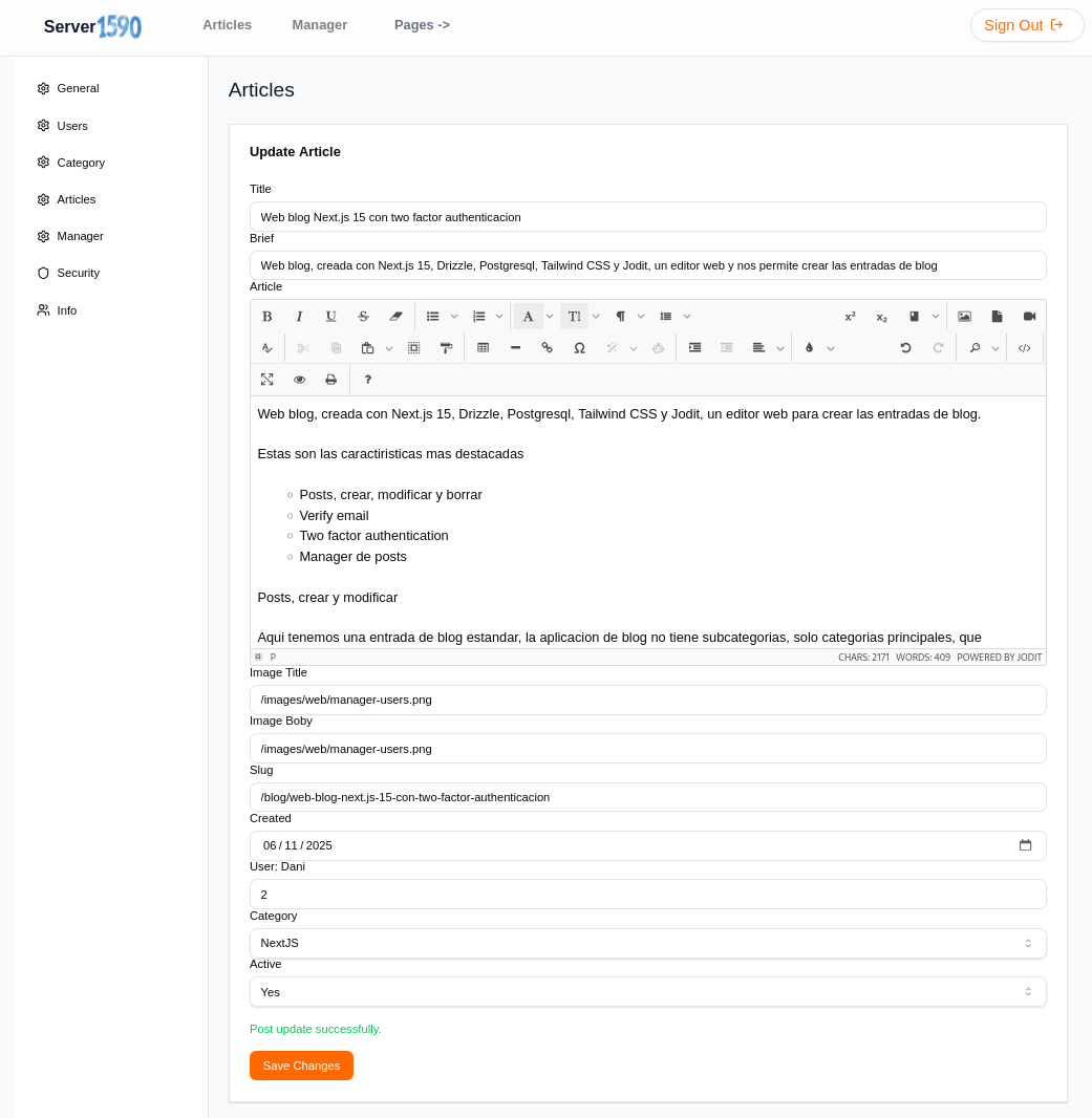 Web blog, creada con Next.js 15, Drizzle, Postgresql, Tailwind CSS y Jodit, un editor web para crear las entradas de blog.